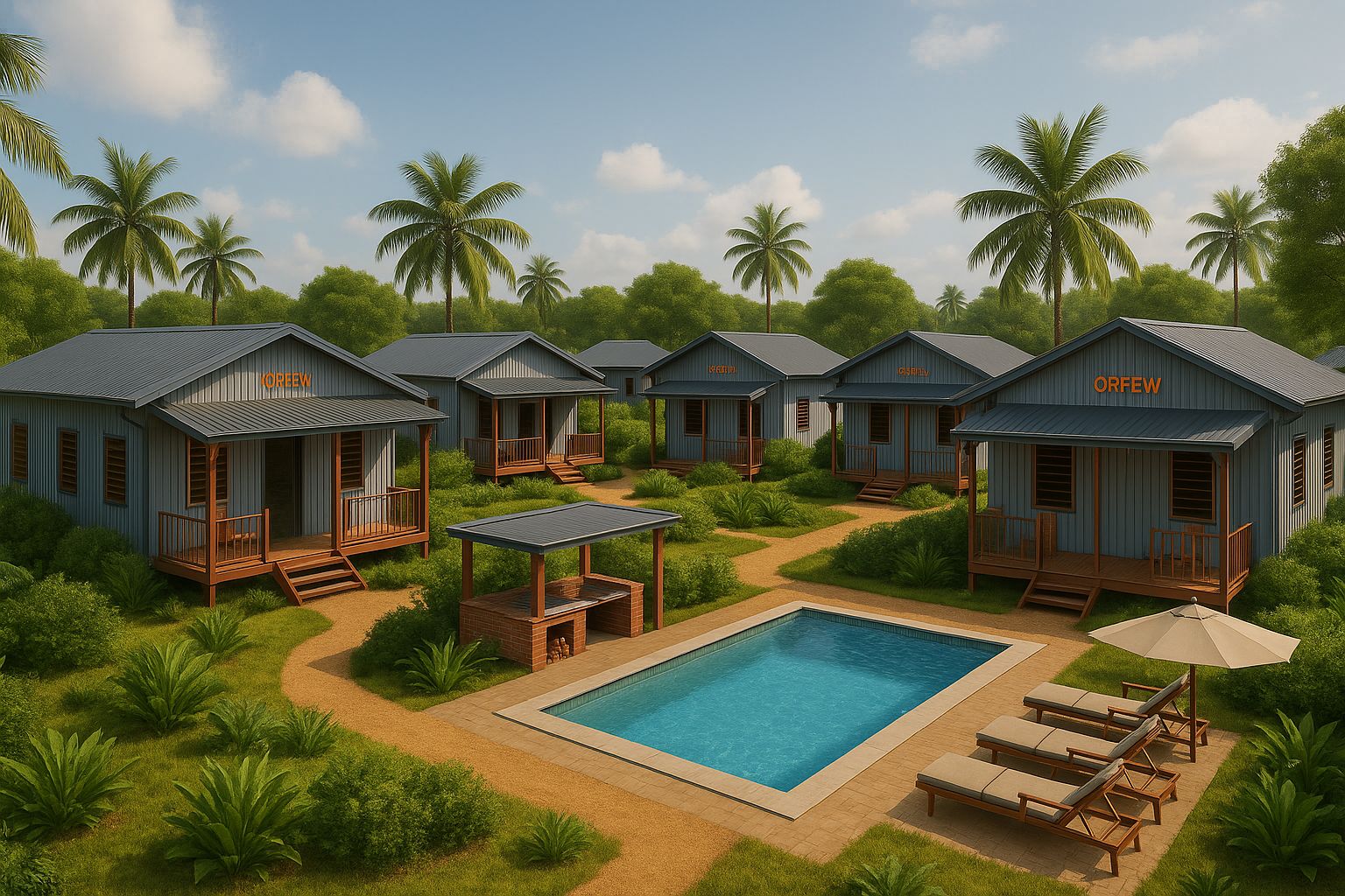 La gamme HOMY conjugue modernité, raffinement et confort. Structure acier galvanisé, anticyclonique, antisismique et anticorrosion — parfaitement adaptée aux environnements tropicaux.